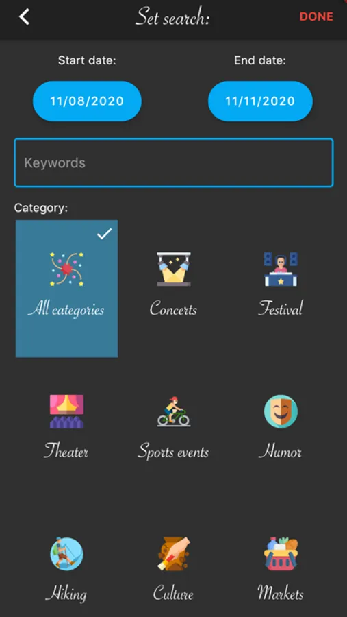 • Events divided into CATEGORIES: concerts, festivals, theater, sporting events, comedy shows, children's parties, hiking, culture, markets, and more.