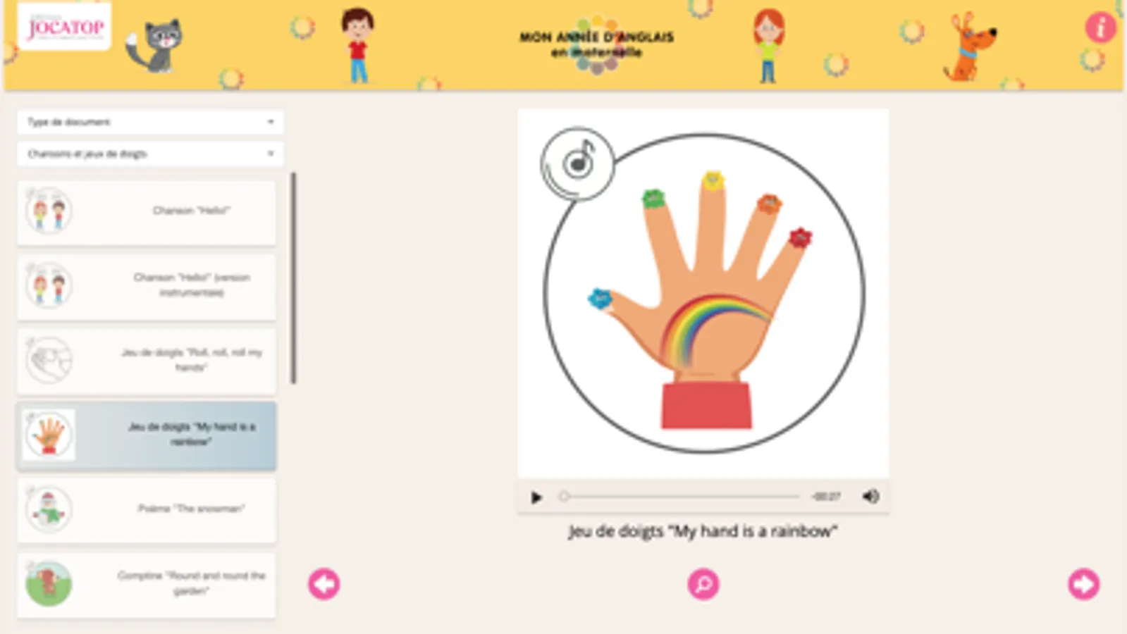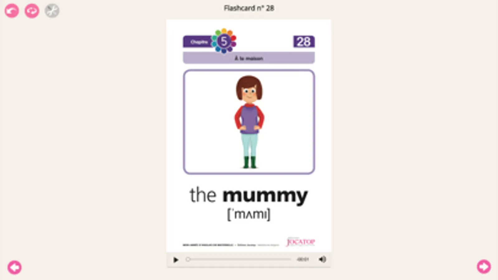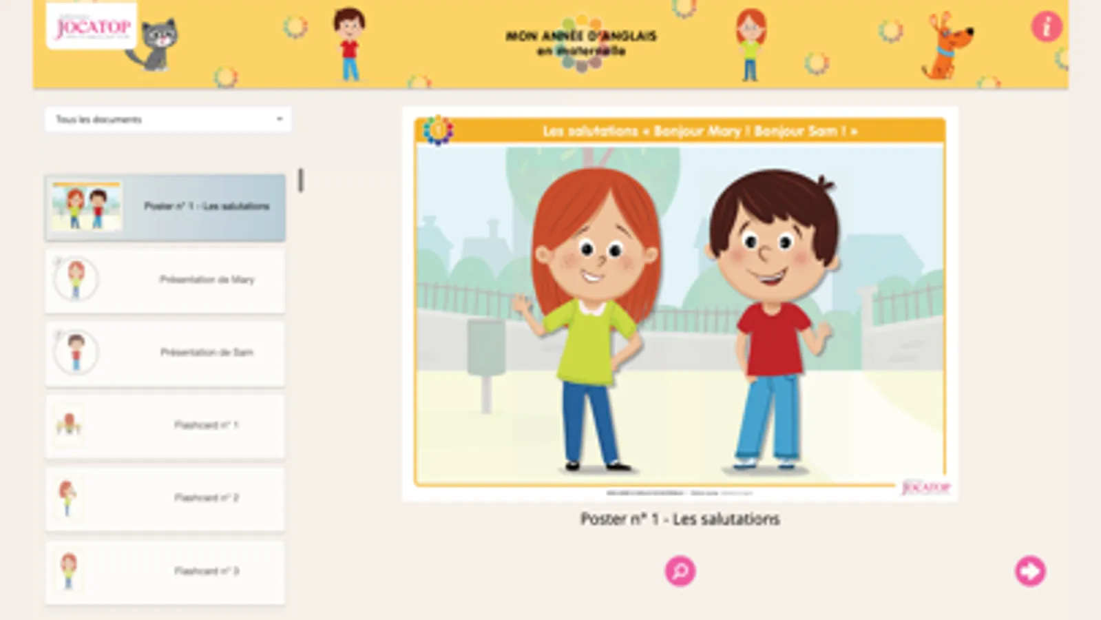 L’application permet de projeter les posters et illustrations, d’écouter les dialogues entre les enfants ainsi que l’ensemble du vocabulaire.