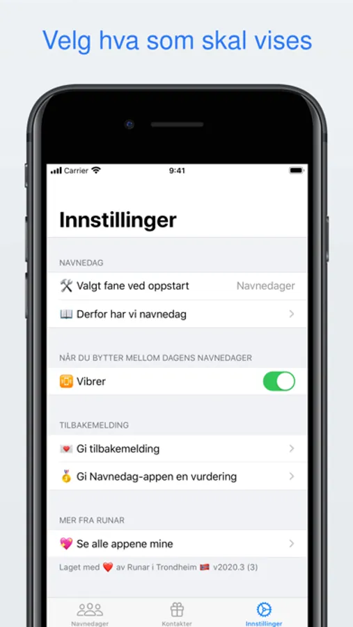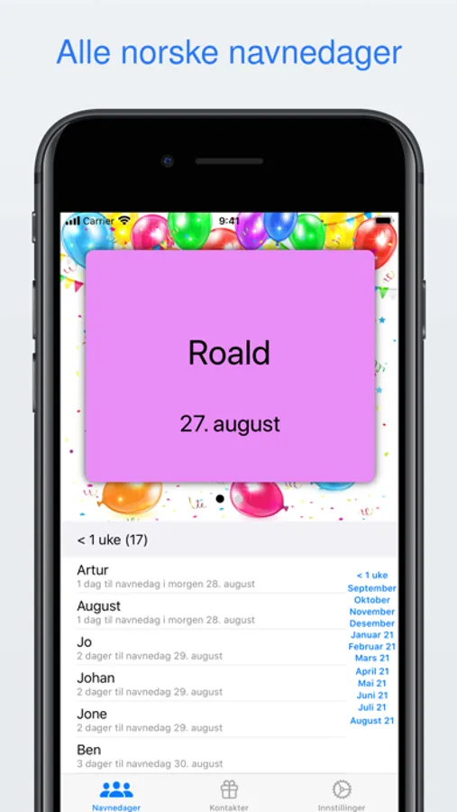 Navnedag er den kjappeste måten å få oversikt over norske navnedager. Navnedag viser deg dagens navnedager og en liste over de som kommer. I tillegg kan du lære bakgrunnen for navnene og se når noen i kontaktlisten din har navnedag.