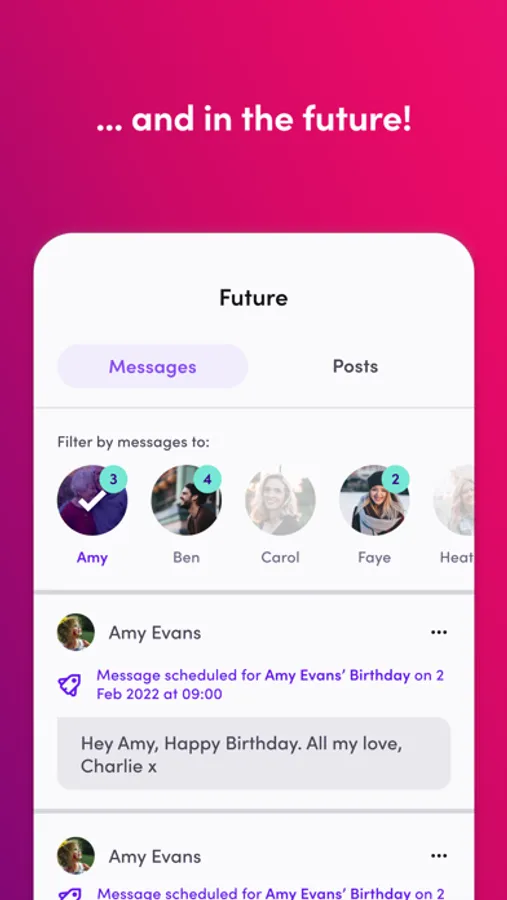 Send posts to the group that open on a date in the future you specify. Do the same with messages to individual members of your Kin family.