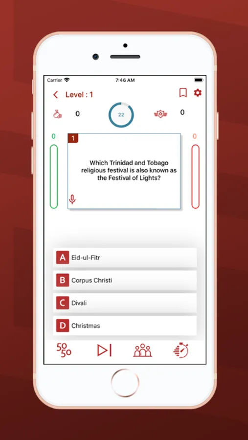 • 50 - 50: remove two options out of four (cost 4 coins)