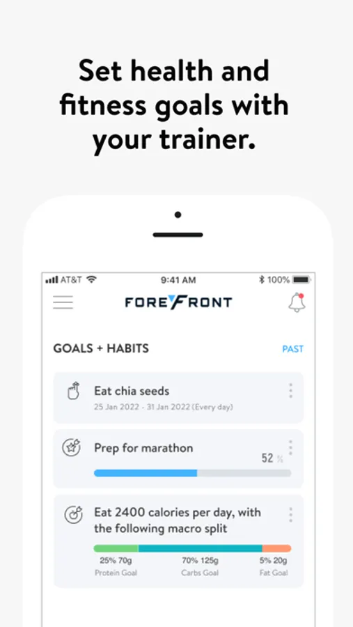 The Forefront 168 App is the portal to premium, personalized fitness and performance coaching. Our clients can use this app to communicate with their coach, track and follow custom workouts, get nutrition plans, and get access to client-only content.