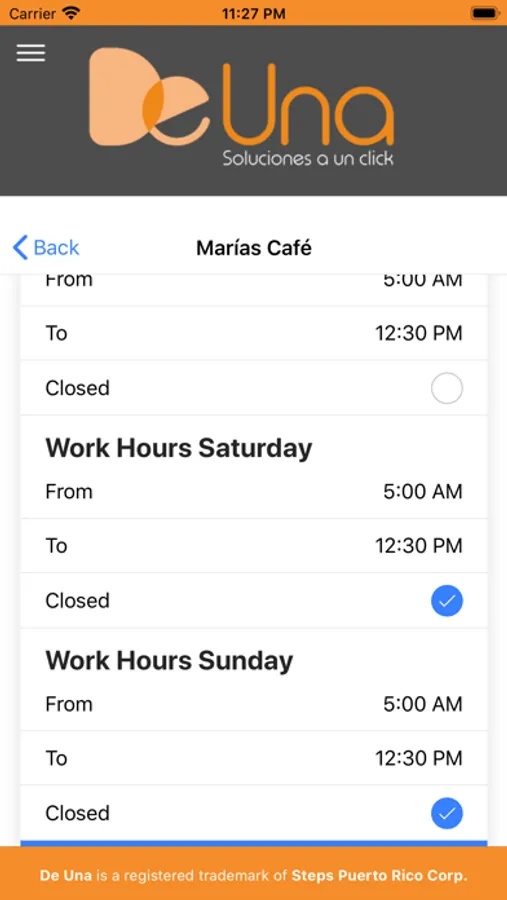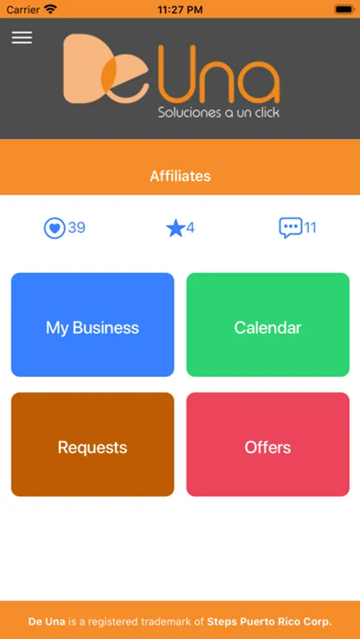 De Un Affiliates is an app designed for business owners in the De Una app directory. Here business owners can manage their information such as hours of operations, confirm code requests to receive feedback, answer requests for scheduled visits, and view their average ratings, how many users have favorited and how many comments they have received.