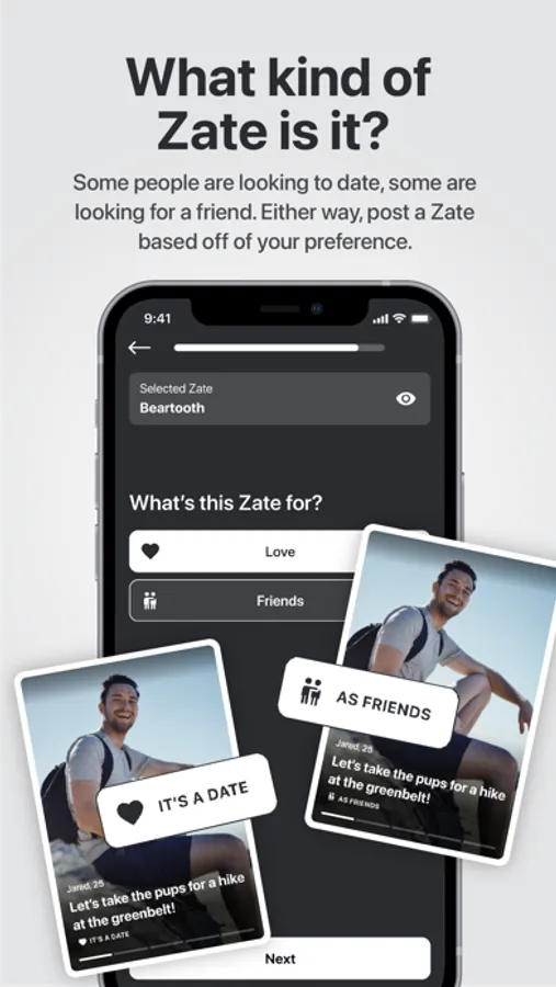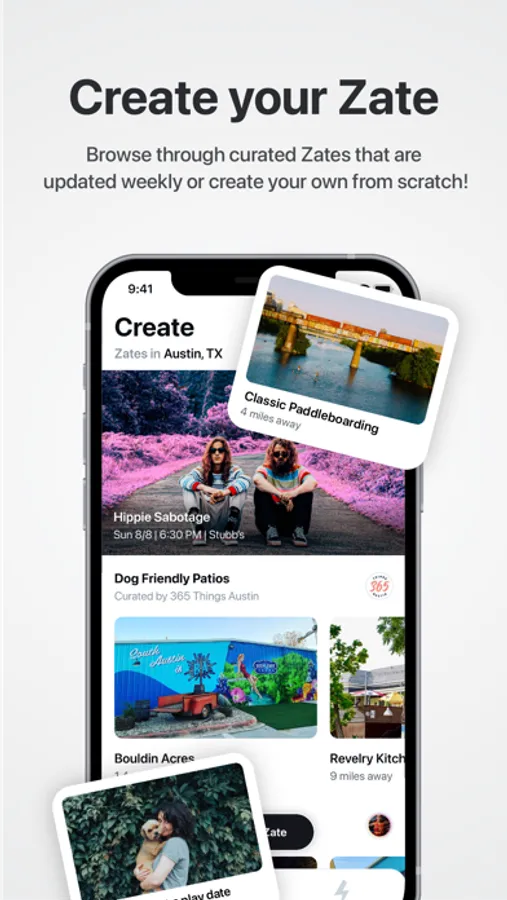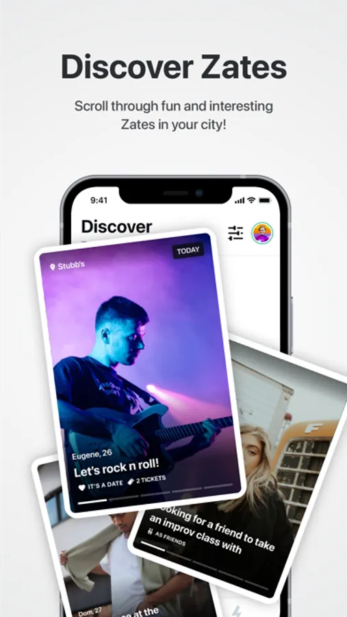 Scroll through the Discover page to see who’s out there and what they are up to. Find everything from your next paddleboard partner to someone who has an extra ticket to your favorite band. Whether you are looking to find friends or go on your next date, adjust your filters on the discover page to find the Zate that matches your personal preference.