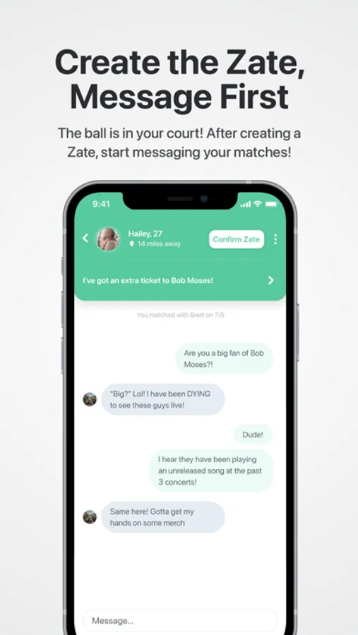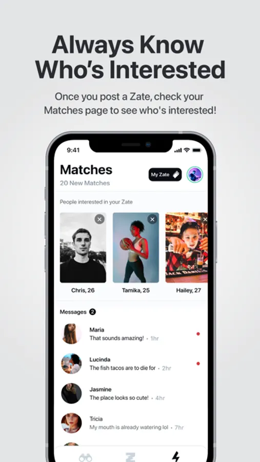 When you create a Zate you message first, simple as that. Filter through all your Zate prospects and get to messaging. As soon as you message someone who is interested in your Zate, that person becomes a permanent match! Once we’ve got you that far, the rest is up to you!