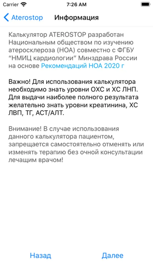 Калькулятор Aterostop разработан Национальным обществом по изучению атеросклероза (НОА) совместно с ФГБУ “НМИЦ кардиологии” Минздрава России на основе рекомендаций НОА 2020г.