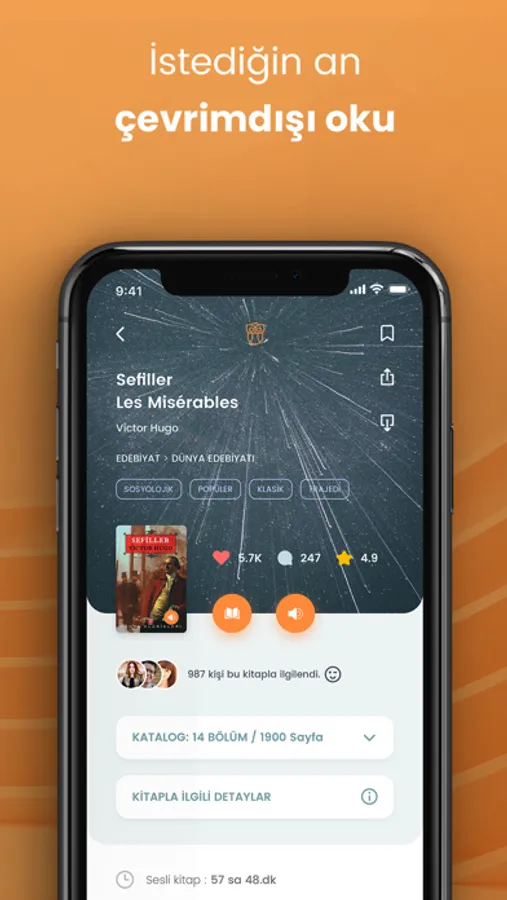 Yerli, yabancı, popüler ve klasik eserlerin bir araya toplandığı uygulamada, kategoriler arasında ayrıntılı bir şekilde arama yapabilir, takip ettiğin yazar ve yayınevleriyle ilgili daha fazla bilgi edinebilirsin. Seçtiğin kitaplardan kendi kütüphaneni oluşturarak çevirimdışı olduğun zamanlarda bile onlara ulaşabilir, okuyabilir ve dinleyebilirsin. Okuma ve dinleme deneyimini en üst seviyeye çıkaracak kullanıcı dostu özelliklerle donatılmış uygulamada, sesli kitaplar içeriğine göre seçilmiş profesyonel ses sanatçıları tarafından, stüdyo ortamında hazırlandı. Aynı şekilde okuma konforunuzu en üst seviyeye çıkarmak için, uygulama içindeki tüm e-kitaplar epub dosyaları şeklinde yüklendi.