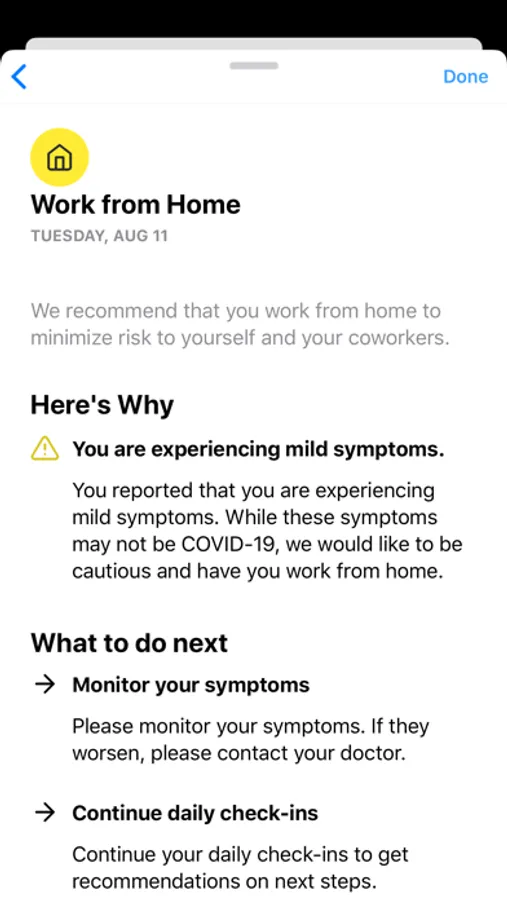 The application offers a way for employees and contractors of the Redstone organization to do a daily check-in where they answer a set of questions related to their symptoms, travel, and other information. Based on the screening, and in accordance with federal, state, local guidelines, Redstone makes a recommendation for the employees to come to work or stay at home.