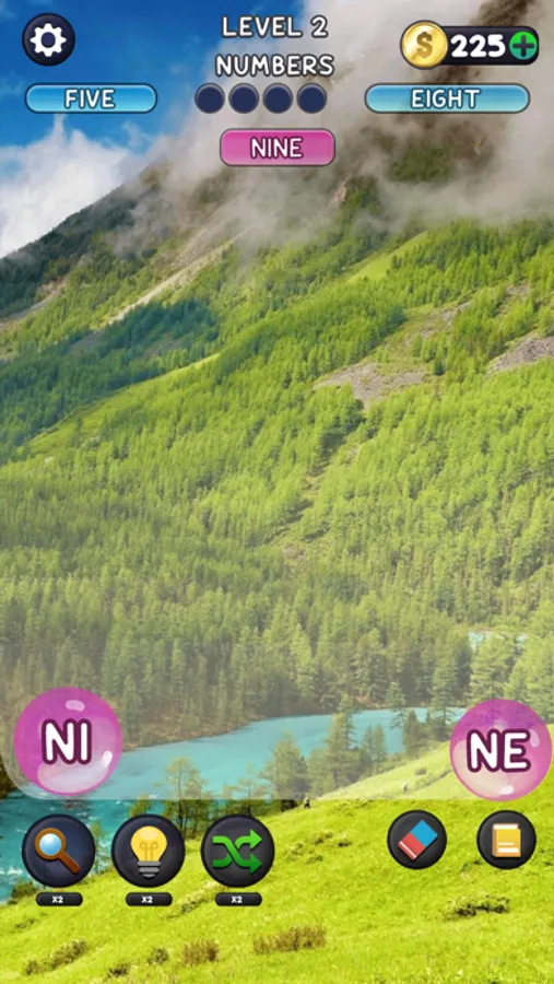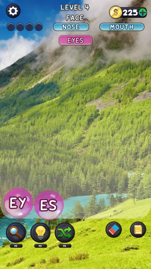 + Click on the light bulb icon button to get a hint of the first syllable of the vocabulary you will lose 75 coins