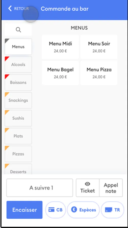 Appel note , création de note et encaissement complet du ticket depuis le PAD.Code login version démo = 1234