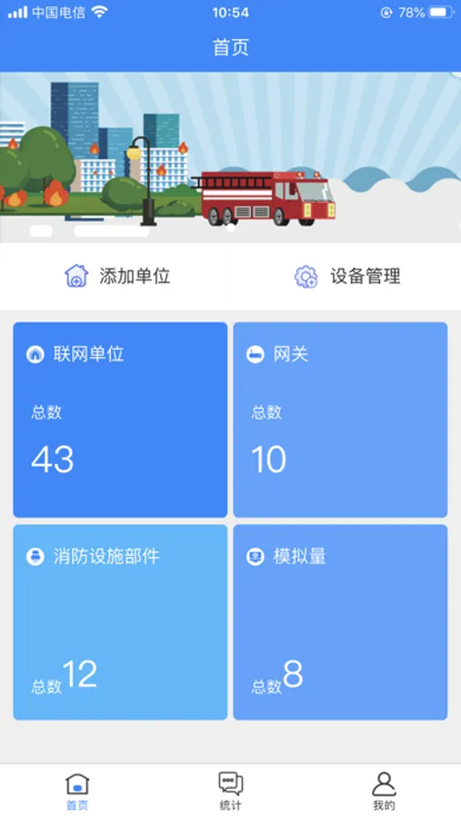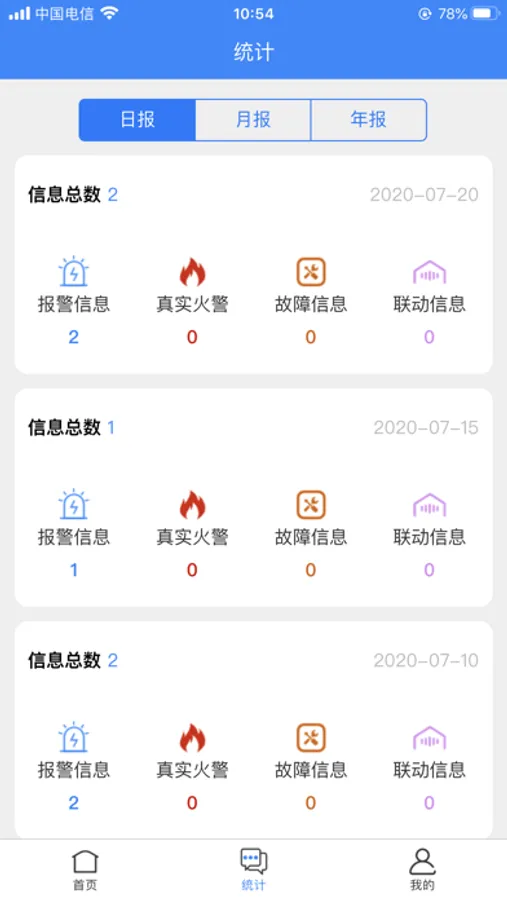 CFS119-运维中心APP可用于对监控管理中心接收到的警情信息分类统计,消防安全管理部门,联网建筑总队,支队,联网单位等操作员可以通过自己的账号登录并查看相关的统计数据。