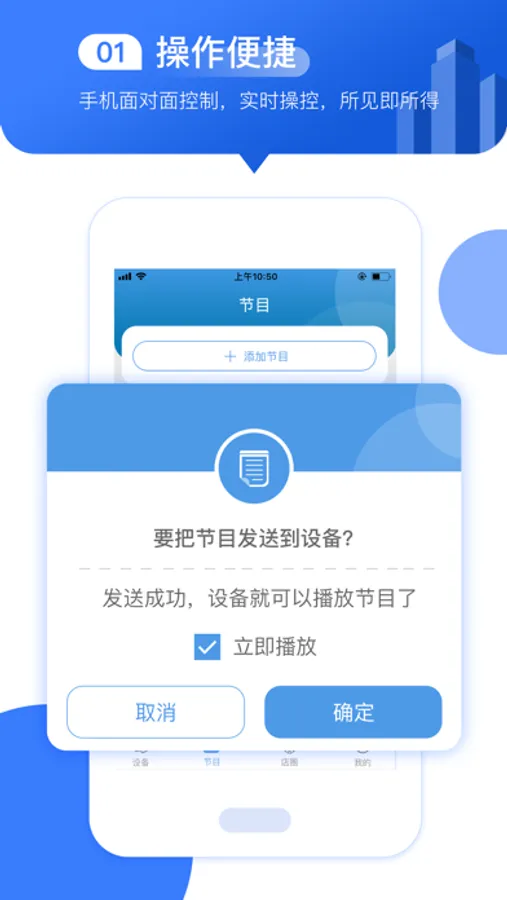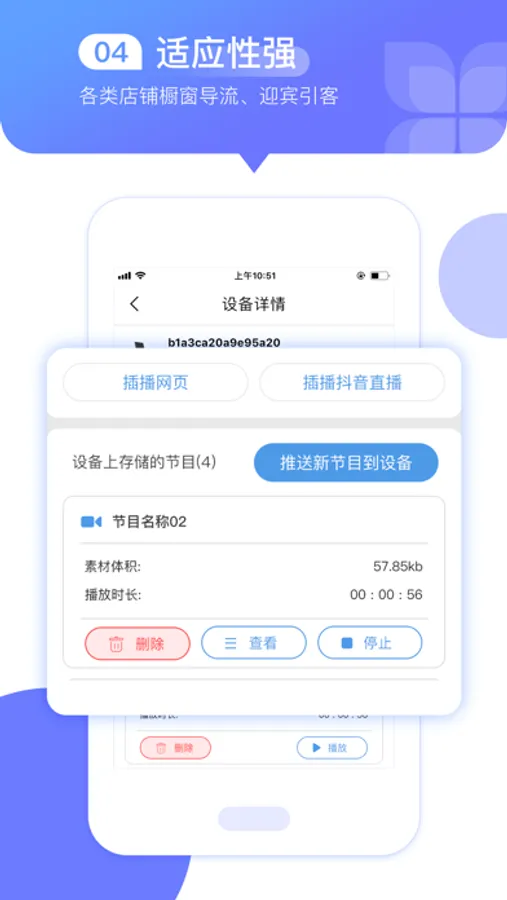 通博客是一款具备智能引客导流功能的一体机产品,用户可以通过手机便捷的管理一体机设备,控制设备进行宣传导引短视频、图片、滚动字幕播放,并支持实时播放直播、网页等,适用于各类店铺橱窗导流、迎宾引客各种应用场景。本APP需要与实体店信发播放设备绑定使用。