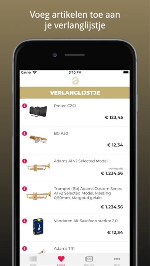 Gebruik de scan-functie om meer informatie over de artikelen te verkrijgen als u in een Adams Music Centre bent. Zie direct de prijs en eigenschappen van het gescande artikel en vergelij het met andere artikelen. Er is geen account nodig om de artikelen te scannen. Hebt u wel een account, dan kunt u gescande artikelen bewaren in een lijstje om ze later terug te vinden.