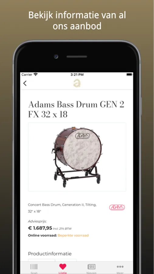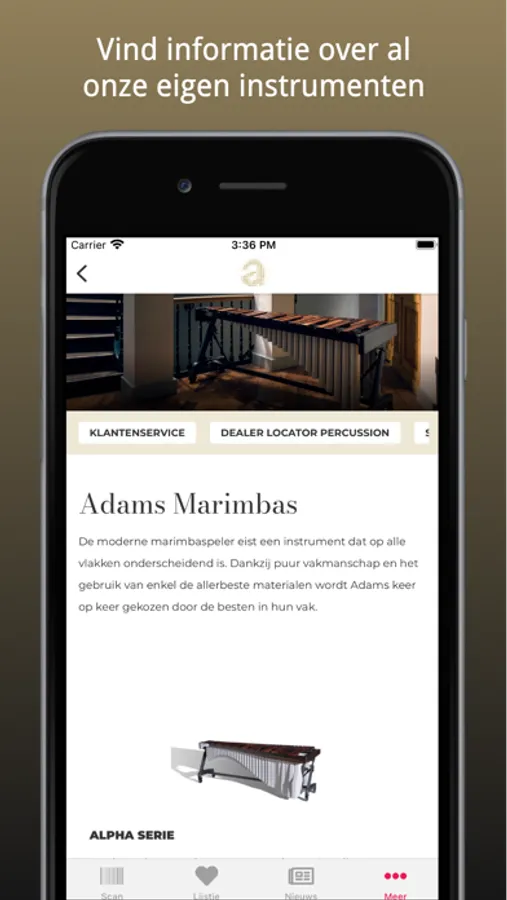 Met de MyAdams app van Adams Music Centre ontdekt u de wereld van Adams Musical Instruments. Maak kennis met de in Nederland gefabriceerde high-end slag- en blaasinstrumenten, maar gebruik de app ook om bijvoorbeeld artikelen te scannen in de Music Centres van Adams in Ittervoort (NL) en Lummen (B).