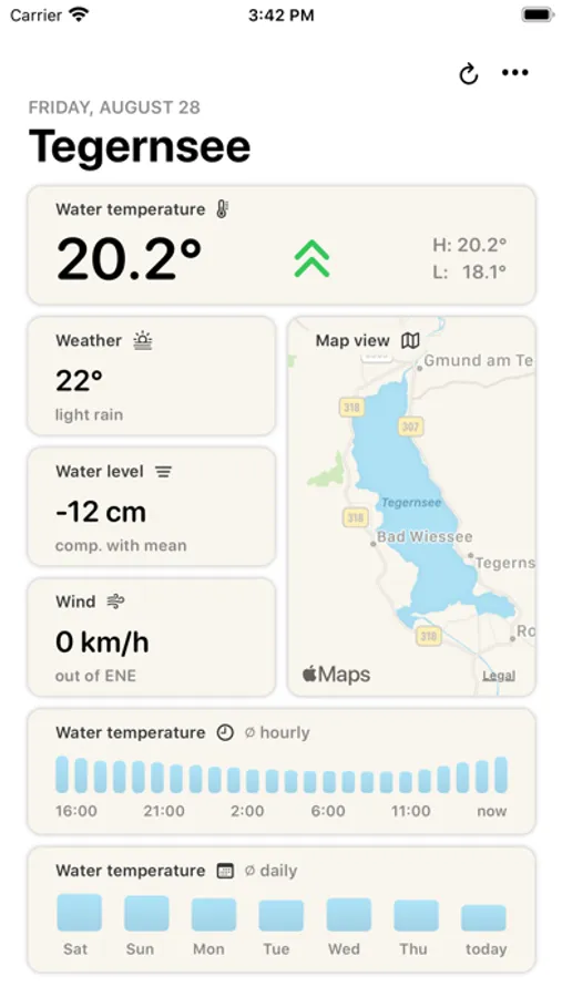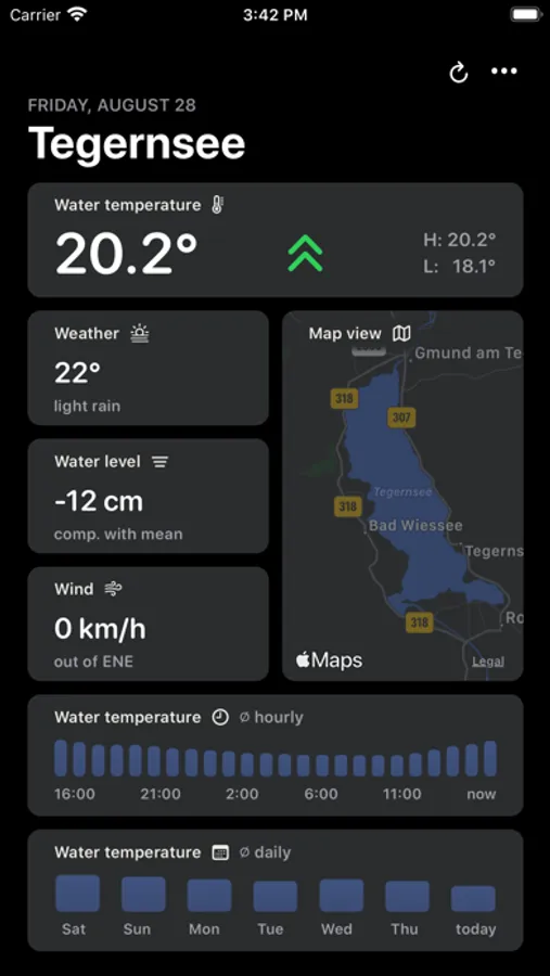 The Tegernsee app shows you the lake's current water temperature, calculates a daily trend and informs you about storm warnings. All in a simple, sleek design. So you can see what is important at first glance and are informed faster. So jump into the water! Provided it is warm enough ;)