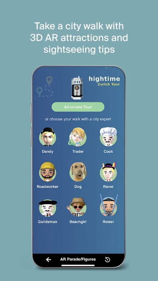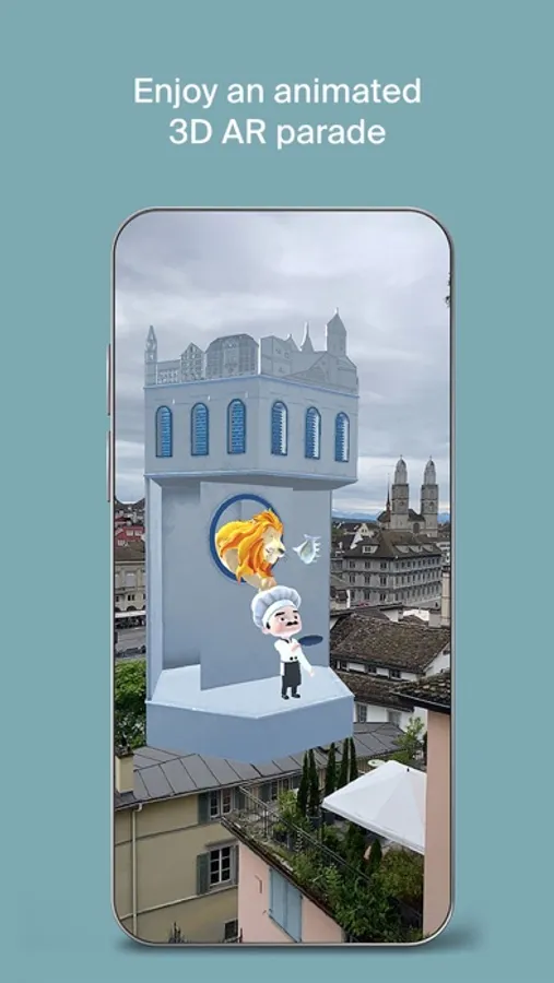 Never used an AR app before? Get started now with Hightime and you’ll love the experience of transforming the world around you. Hightime makes it really easy to do. There are full visual and verbal instructions on how to place the AR objects in the environment but no more detail than you need. You can just blend out any superfluous instructions. We have built in great flexibility in positioning the 3D AR objects. You can locate them closer or further away from you, elevate, rotate, and scale them to get exactly the view you want and create your masterpiece. You can adjust the position of the AR objects at any time. And the camera function lets you easily take and share great pictures of the parade and figures against the city background. So download Hightime now, grab the essence of Zurich in the palm of your hand, and join the party.