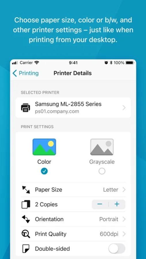 - Choice of paper size, color or black and white, and other setting options, just as you would with desktop printing
