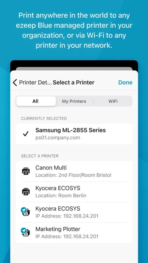 - Print to any ezeep Blue managed printer in your organization, anywhere in the world, thanks to cloud printing.