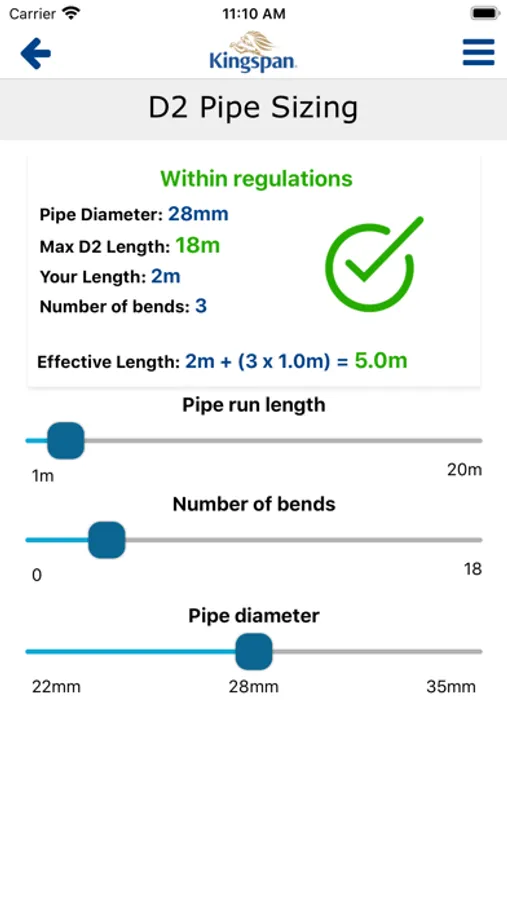 D2 PIPE SIZING tool will help you ensure your pipework is Building Regulations compliant. Just specify your pipe diameter, pipe run length and number of bends and you’ll know instantly if it falls within regulations.