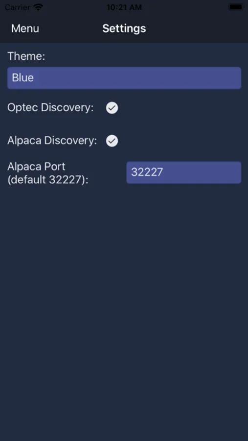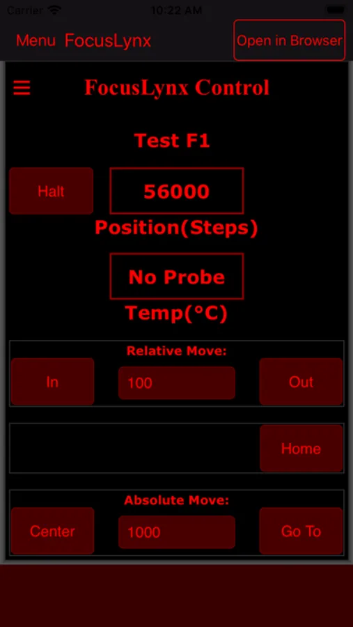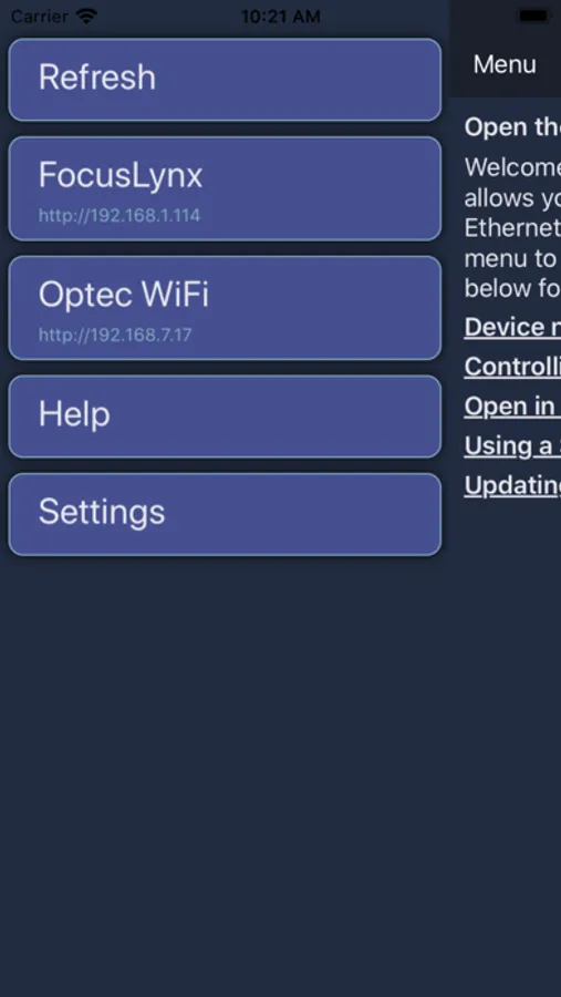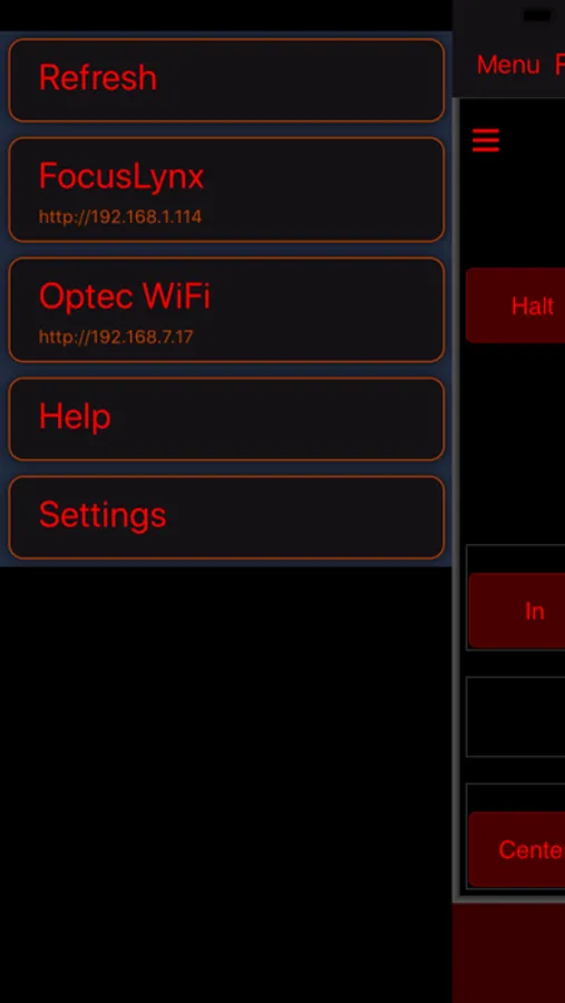 The Optec Remote app allows users to control Optec products over Ethernet or WiFi. It works with Optec's native device networking and Optec's Alpaca drivers. This requires the device to be connected to the same network as the iPhone.