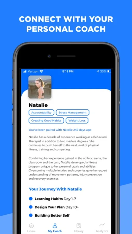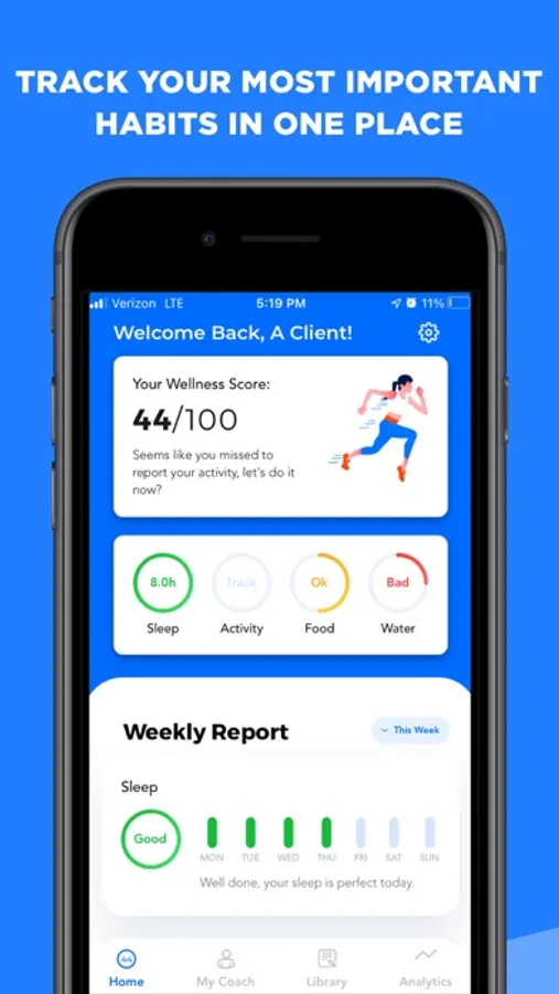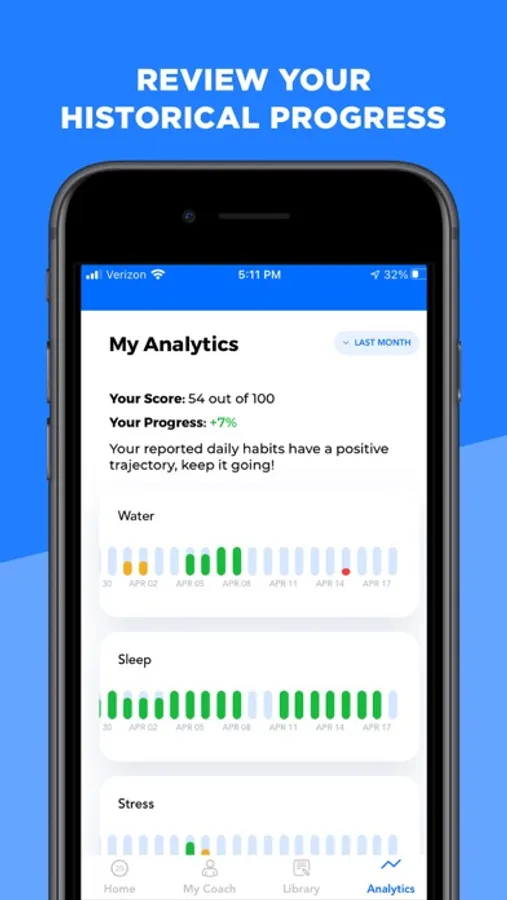 Verb mobile app serves as an extension of the platform designed to help users track their daily habits and change them for the good. Verb is a conversation-first platform so all the communication happens via text messages and the mobile app serves as a destination to review all of the tracked data (food, water, sleep, activity, mood, daily journals) as well as add any custom reminders. Users can signup through the app or login with their existing profile using the cellphone number that is already used for SMS communication.