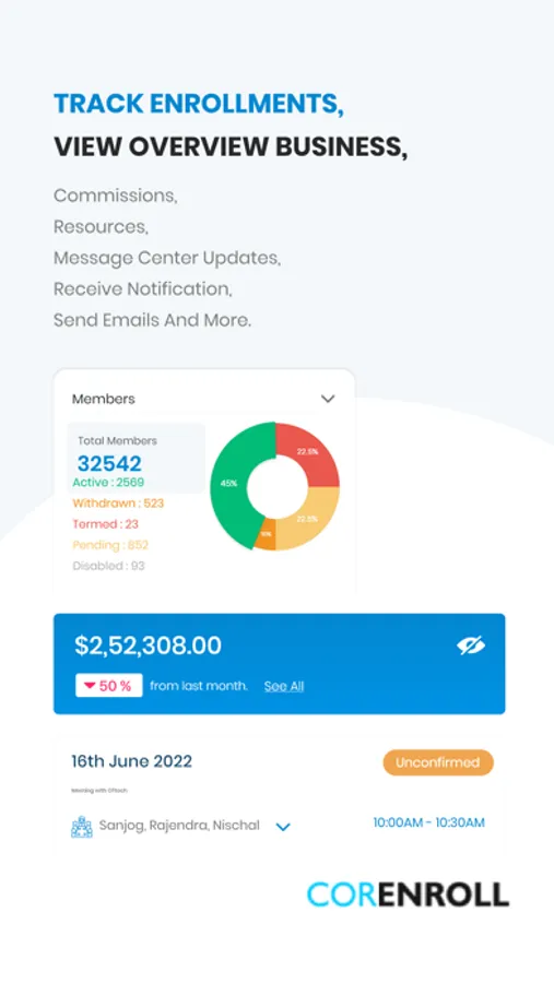 It’s easy to handle your business on-the-go with Corenroll Rep. Track Enrollments, view Overall Business, Commissions, Resources, Message Center updates, Receive Notifications, send emails and more.
