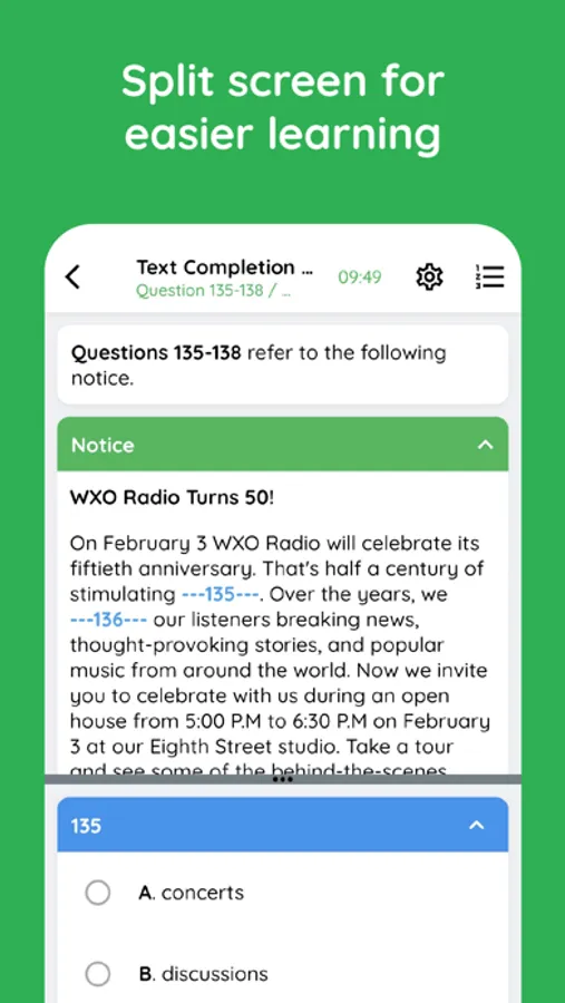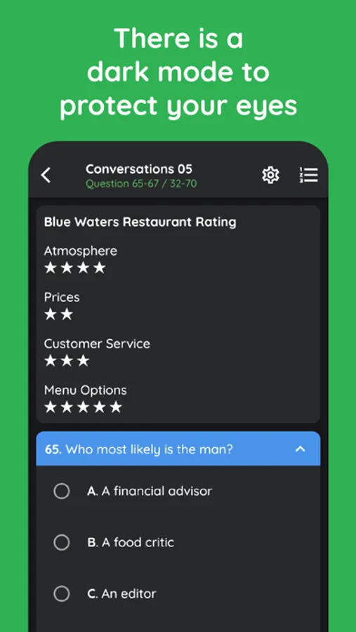 - Support features such as changing font size, font family, automatic question switching, split screen, increase and decrease the audio speed.