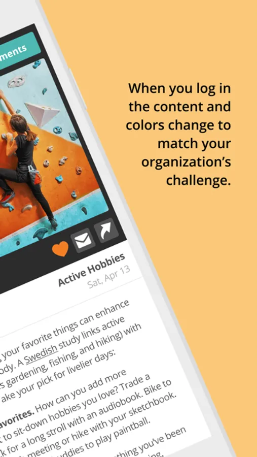 The +Wellness app works with your organization’s wellness challenge. When you log in the content and colors change to match your organization’s challenge. Elements include:
