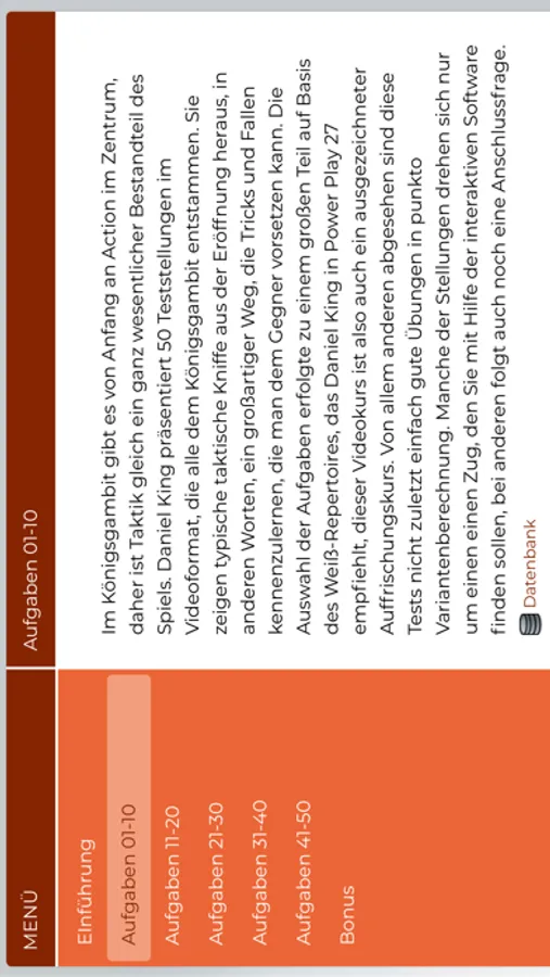 Die Auswahl der Aufgaben erfolgte zu einem großen Teil auf Basis des Weiß-Repertoires, das Daniel King in Power Play 27 empfiehlt, diese App ist also auch ein ausgezeichneter Auffrischungskurs. Von allem anderen abgesehen sind diese Tests nicht zuletzt einfach gute Übungen in punkto Variantenberechnung.
