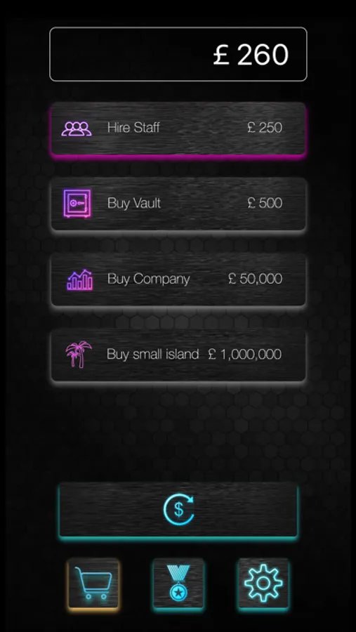 Click away and build your empire, hire staff to help and buy vaults to store your growing pile of cash. Buy companies to earn even more per click, or buy a small Island because, well everyone wants a small island don't they?!
