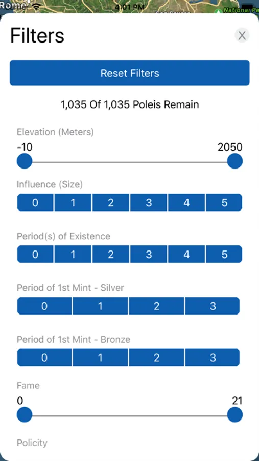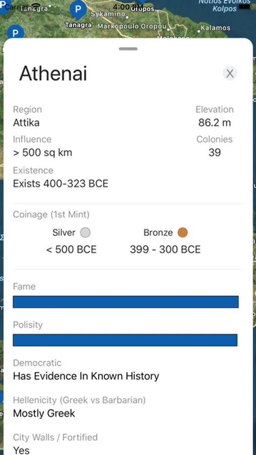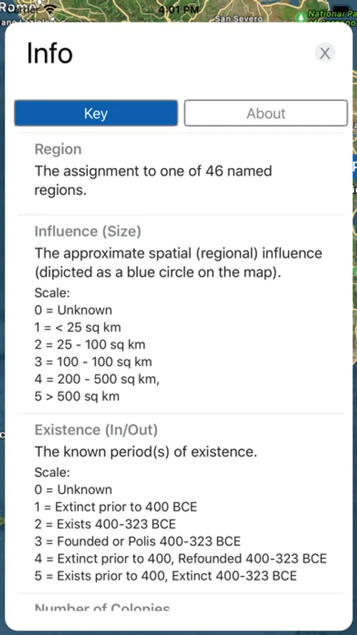 The Polis-Inventory app is informative and interactive, allowing for visualization, searching and filtering of the Poleis based on a set of physical and historical parameters. A Key to the parameters is provided. Further detail about, and accreditation of, these data can be found at polis.stanford.edu and the Inventory itself.