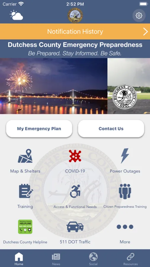The Ready Dutchess mobile app is an interactive app designed to improve alerting and preparedness for the citizens of Dutchess County, NY. Some of the items featured in the app include emergency alerts, local weather, social media, a fillable emergency preparedness plan, local utility outages and closings, and training opportunities.