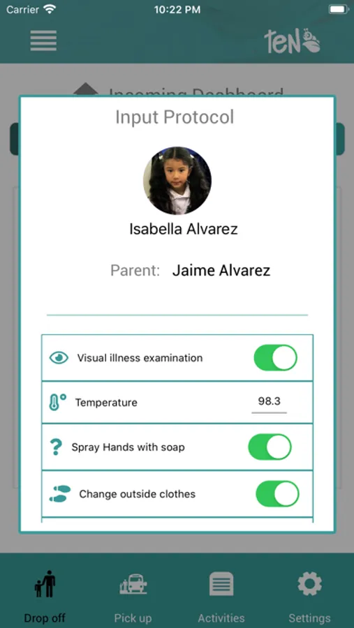 While the teacher completes the information's entry, the App will generate the daycare protocol's validation. The gathered data will follow the CDA recommendation for early learning centers included but not limited to taking and verifying the child's temperature, disinfection of shoes, change of clothes, arrival time, etc.