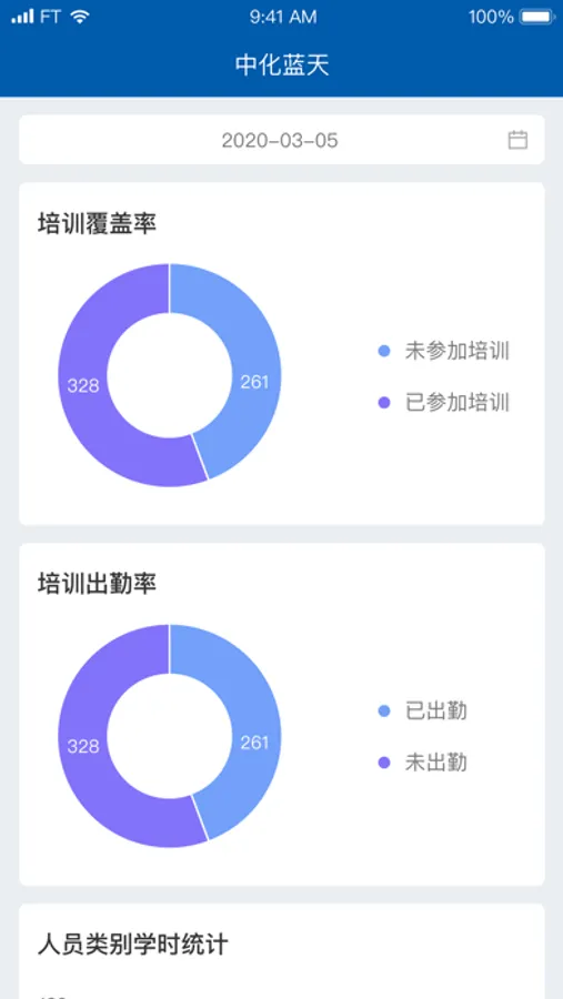 查询任意时间维度内集团培训覆盖率、培训出勤率、不同类别人员培训学时的培训情况。