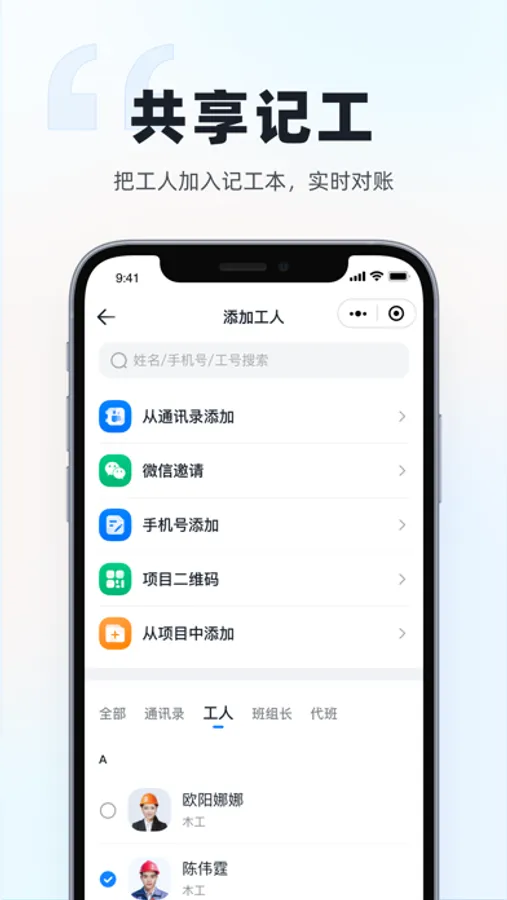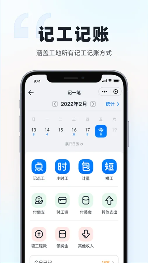 把工人加入记工本,点击一下或人脸考勤即记工成功,工人收到通知,实时对账。支持手动记工或人脸考勤记工,支持点工、小时工、计量、短工、加班、工程款、借支、奖金、材料费等工地所有记工记账方式。数据灵活统计一键导出表格,数据永久保存。