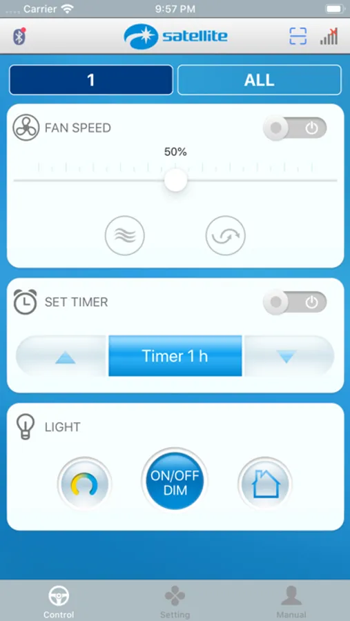 Remote control your compatible devices by using your phone or tablet. The app when paired with our smart controller can operate your fan by turn on/off, change speeds and control your light kit including dimming feature.