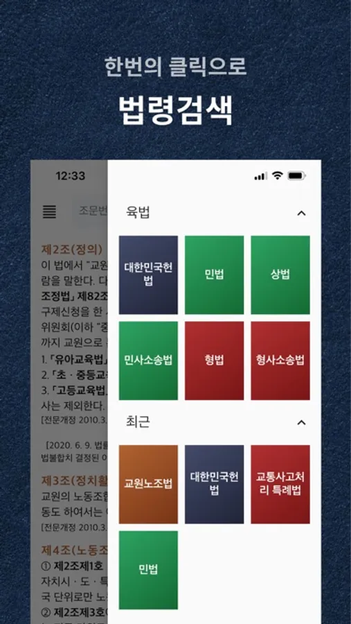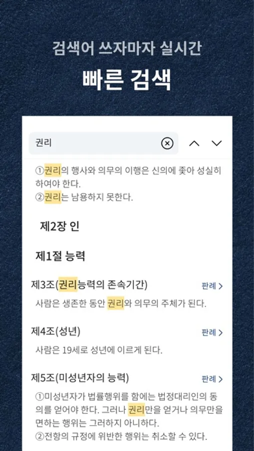 - 빠른 검색: 검색어를 쓰자마자 실시간으로 검색 결과를 제공합니다. 조문번호와 키워드를 한 곳에서 검색할 수 있어요.