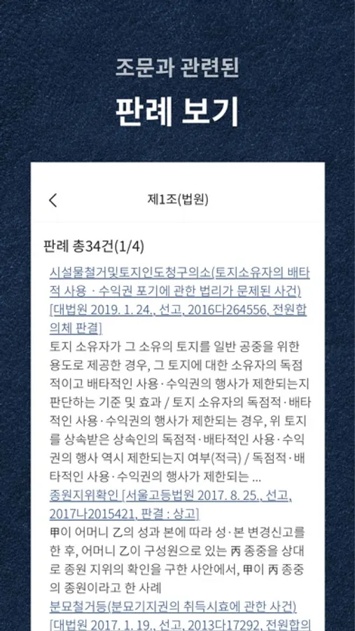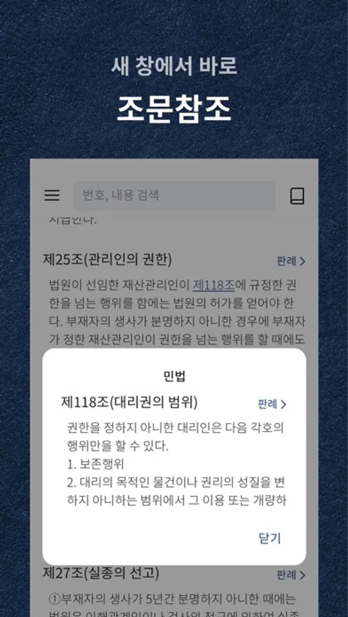 - 판례 보기: 조항과 관련된 판례를 새 창에서 바로 확인 할 수 있습니다. 판례 번호와 내용으로 검색해서 찾을수 있습니다.