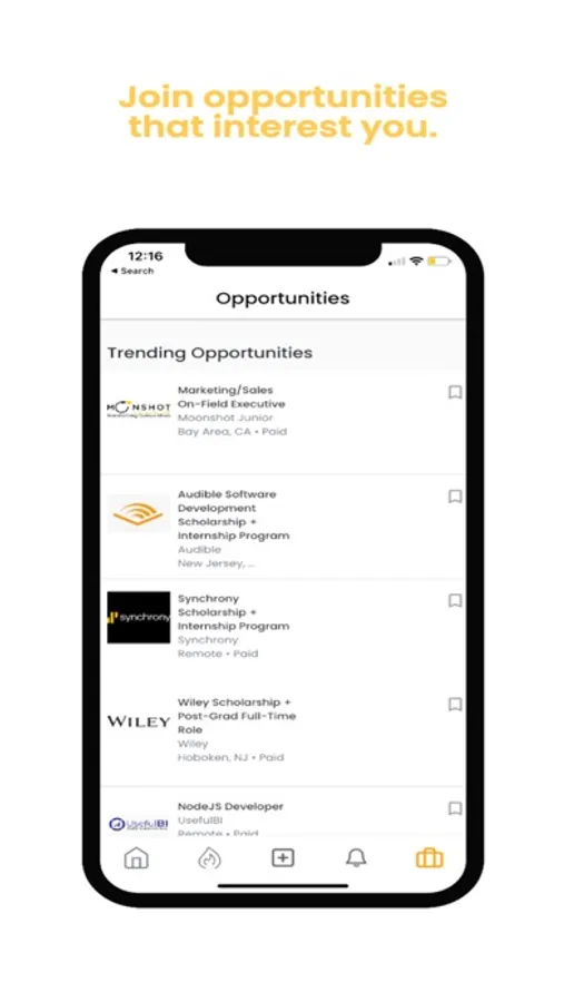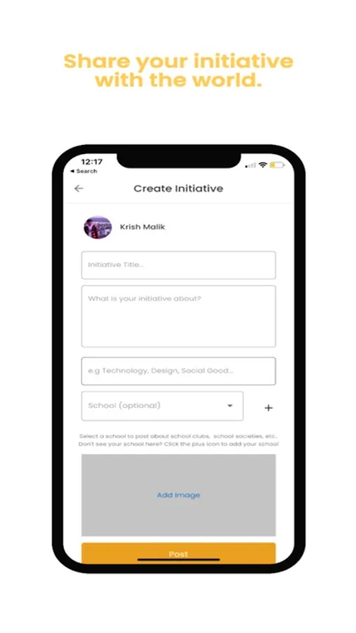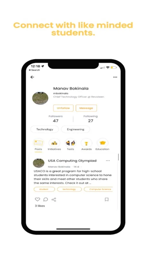 As users begin to create initiatives and post on the app, they have a chance to build their own profile: adding test scores, accomplishments, and even interests. Further, they are able to add their education and graduation dates, providing opportunities for professionals to reach out to them!