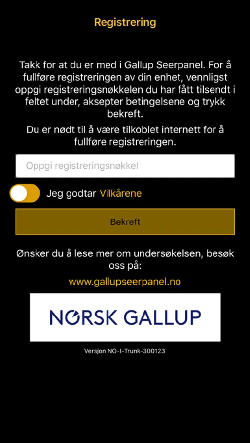 For å benytte Seerpanel appen som fjernkontroll må man oppgi en registreringsnøkkel som man mottar sammen med måleutstyret fra Kantar.