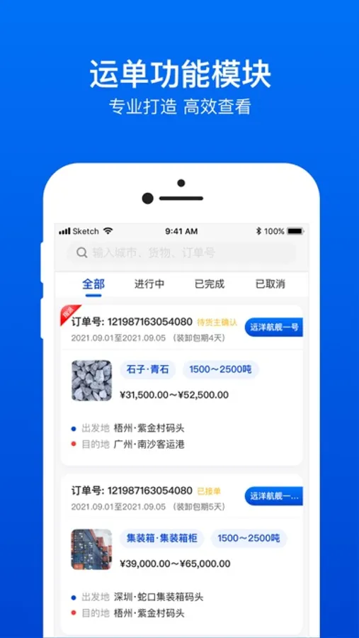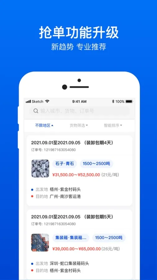不用坐等运单,一键开启极速抢单,帮您快速匹配货源,随时随地,线上看价,筛选合适货源,高价运单不错过,省时省心!