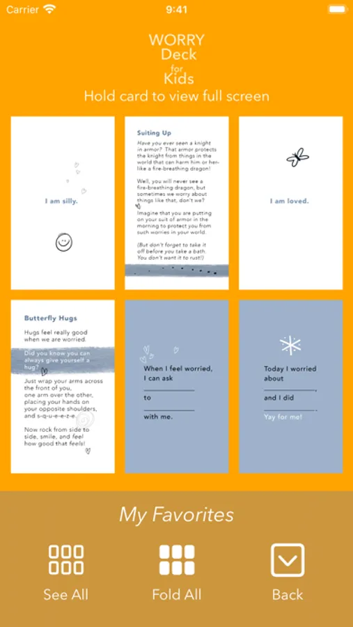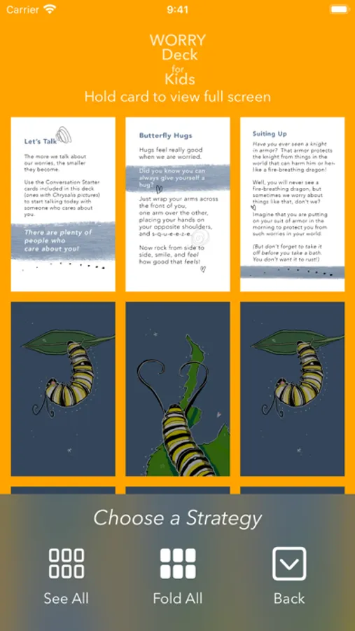 The free version of this app will give you 3 Strategies, 2 Conversation Starters to get you and your child talking about their worry, and 3 Affirmations. Your child will be able to explore, favorite and journal within the app and if you and she/he like what you see you will have the option to unlock all 52 cards for a ONE TIME purchase price.