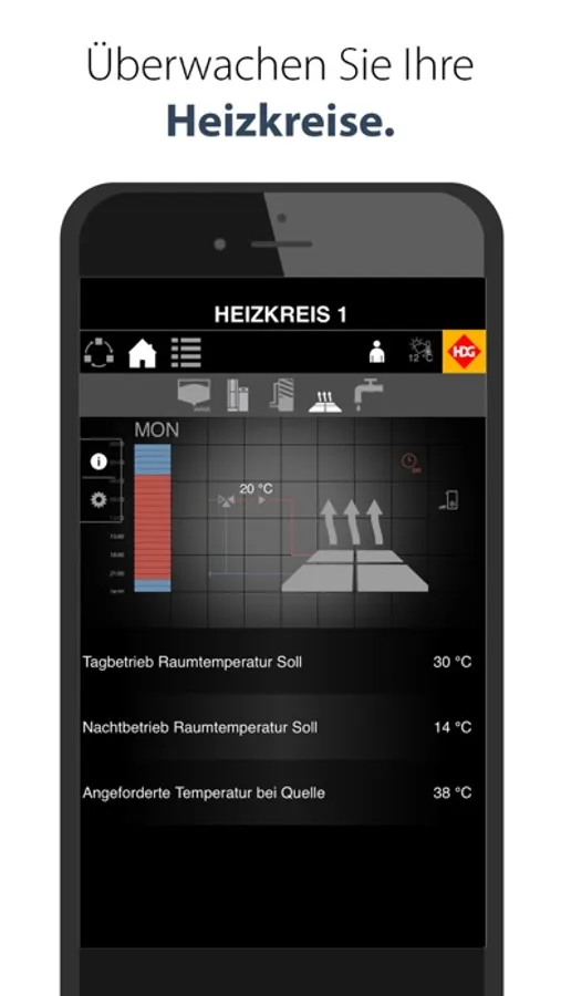 Die Heizung in der Hosentasche: Mit der myHDG-App haben Sie jederzeit einfach und komfortabel Zugriff auf Ihr HDG Holzheizsystem mit WebControl. So rufen Sie rund um die Uhr Informationen ab und nehmen Veränderungen an den Einstellungen Ihrer HDG Holzheizung vor. Steuern Sie Tages- und Wochen-Sonderprogramme (z.B. Urlaubsprogramm) und legen Sie fest, wie warm es in Ihrem Haus sein soll, wenn Sie nach Hause kommen oder wie weit die Temperatur bei Abwesenheit abgesenkt werden soll. Regeln und überwachen Sie Heizkreise und lassen Sie sich darüber hinaus wichtige Informationen per E-Mail schicken. So wissen Sie jederzeit über den Status Ihres HDG Heizsystems Bescheid.