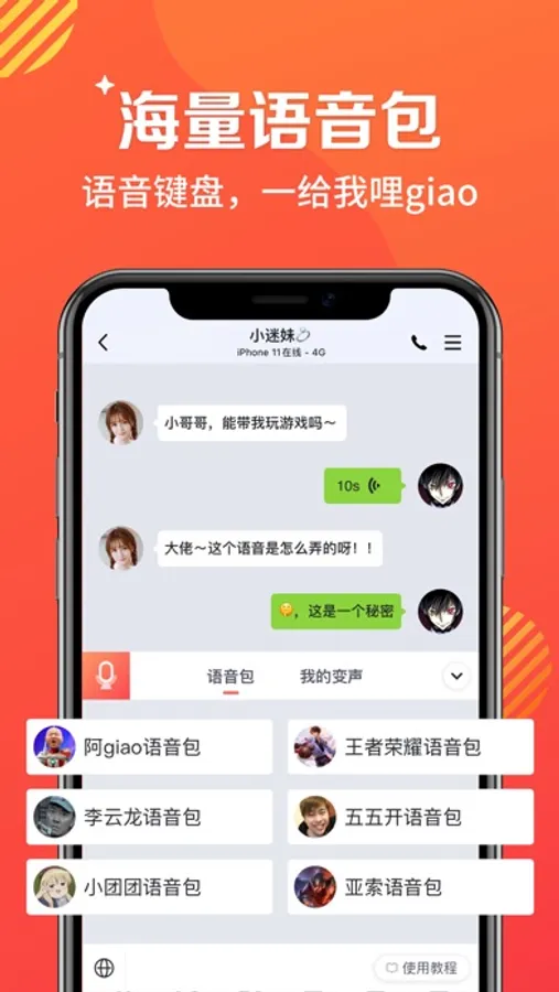 微信,QQ等社交平台、吃鸡、王者、狼人杀,剧情杀等在线桌游,直接切换键盘,一键发布自己合成或热门语音包