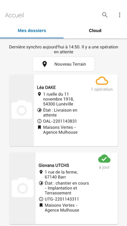 Retrouvez l'ensemble de vos dossiers clients sur cette application mobile, pour y réaliser les visites terrains, suivis de chantier, consulter les documents internes (plans, marchés de travaux, etc.)