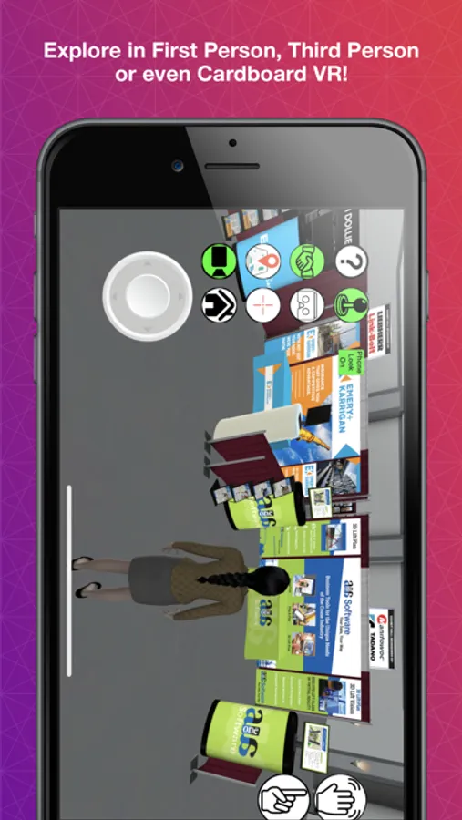 VR Conflux offers a unique virtual experience for conferences, trade shows, and exhibit centers. Wearing a VR headset or iOS app , attendees can walk around the conference, attend education sessions, find friends and associates, and talk to them in real time -- all from the comfort of your home or office! While at the exhibit center, attendees can pick up literature to add to your virtual swag bag, watch videos from exhibitors, and even talk to booth personnel as if you were meeting in person. In the lounge area, attendees can network with each other, virtually shake hands and even give each other high fives.