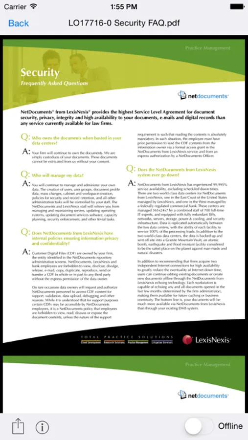 NetDocuments is the premier cloud content management service for businesses of all sizes. Our products enable our customers to securely create, store, manage and share their documents anywhere, anytime. If you are a NetDocuments customer, whose company uses the Intune platform, using this app, along with your organizational information will give you access to all your documents while you are on the go. NetDocuments for Intune enables iPhone and iPad users to securely create, edit, and collaborate on content, while giving your organization's MIS or IT department the administrative control to enforce mobile security policies, control additional security protocols, and manage aspects of the app remotely via the Intune platform.