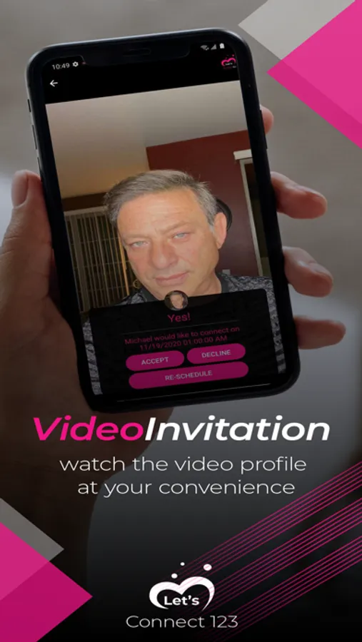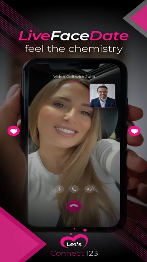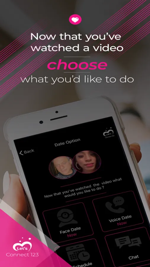 Let's Connect 123 is intuitive in the way it duplicates the natural experience of meeting someone in person. Let’s Connect 123 does not use algorithms or long tedious questions to select a person for you to meet. You select the person through Chemistry, attraction, and vibe.