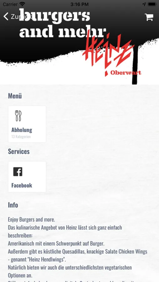Enjoy Burgers and more. Das kulinarische Angebot von Heinz lässt sich ganz einfach beschreiben: Amerikanisch mit einem Schwerpunkt auf Burger. Außerdem gibt es köstliche Quesadillas, knackige Salate und Chicken Wings – genannt „Heinz Hendlwings“. Natürlich bieten wir auch die unterschiedlichsten vegetarischen Optionen an.