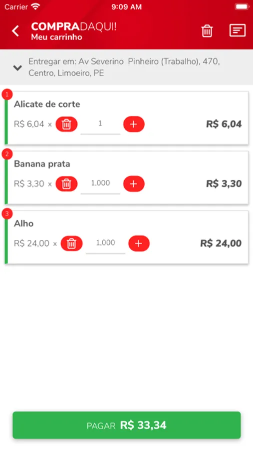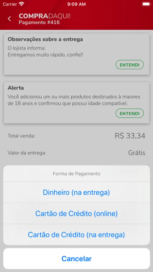Com o carrinho montado o usuário poderá pagar o seu pedido com dinheiro (na hora da entrega) ou com cartão de crédito (online ou presencial, o que vai variar de loja para loja). Após feito o pedido, o usuário receberá notificações sobre o andamento do seu pedido, se ele já foi confirmado, se já foi despachado e ao ser entregue.